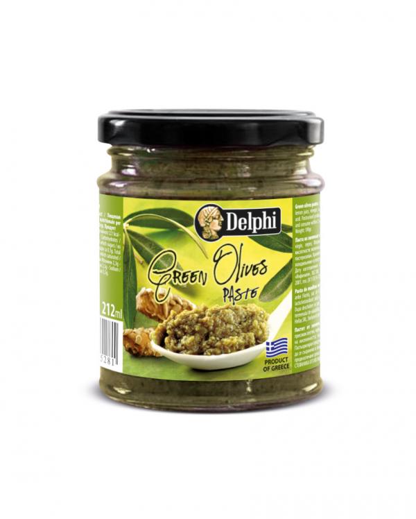 Delphi Green olive paste is a smooth paste made exclusively from Greek Green Olives blended with a mixture of herbs and spices. This strong flavored olive paste can be enjoyed by spreading it on freshly baked warm bread or as flavoring in stocks and sauces. Some prefer to use it as a garnish on specialty dishes.